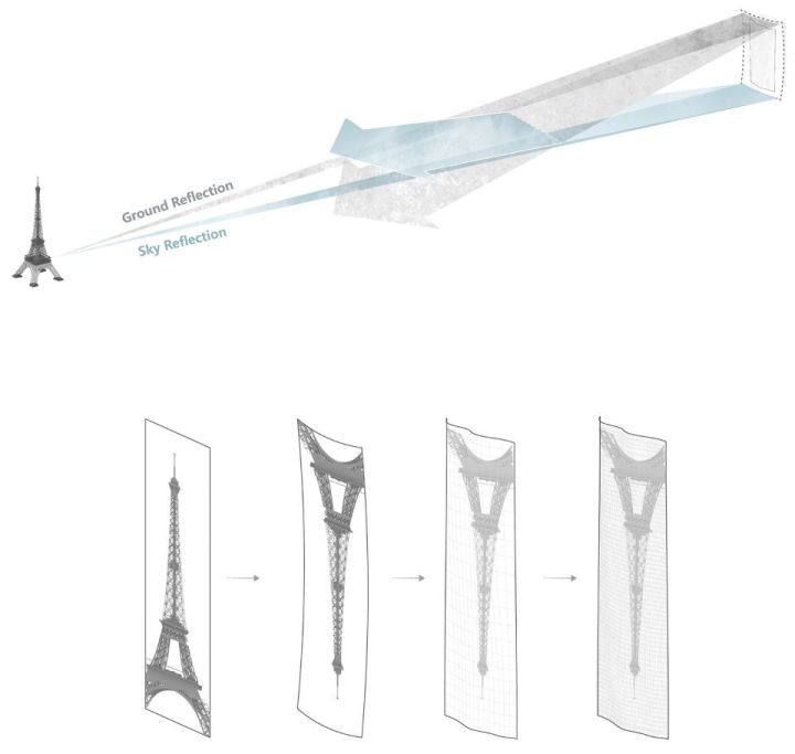 MAD的改造方案,根据光学凹镜原理,将建筑立面的每一片玻璃设定到特定角度,使得整个大楼成为一个城市尺度的凹面镜。在这种光学效应下,楼体所反射的周边景色被上下翻转,巴黎城市的街区,道路以至于周边建筑的屋顶被反射,并倒挂在空中;地平线以上的天空却反射在楼体的下半部分,与背景天空完全相融。海市蜃楼般飘浮在空中的“倒挂巴黎城”就这样形成;如果从埃菲尔铁塔望向大楼,更会看到大楼建筑立面上出现另一座上下翻转的铁塔。