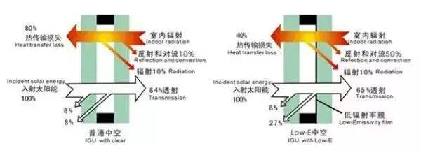 夏季,室外温度高于室内,远红外热辐射主要来自市外,Low-e玻璃可将其反射出去从而阻止热量进入室内。对来自室外太阳能辐射,可选择低遮阳系数的LOW-E玻璃限制其进入室内,从而降低一定费用(空调费用)。