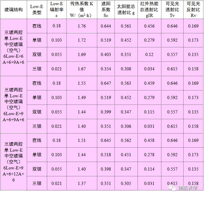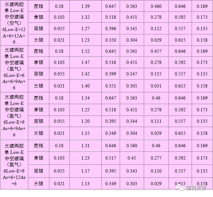 Note:1.该表格数据为WINDOW7.3和GlasSmart1000 3.3计算所得,边界条件依据中国标准JGJ/T 151;